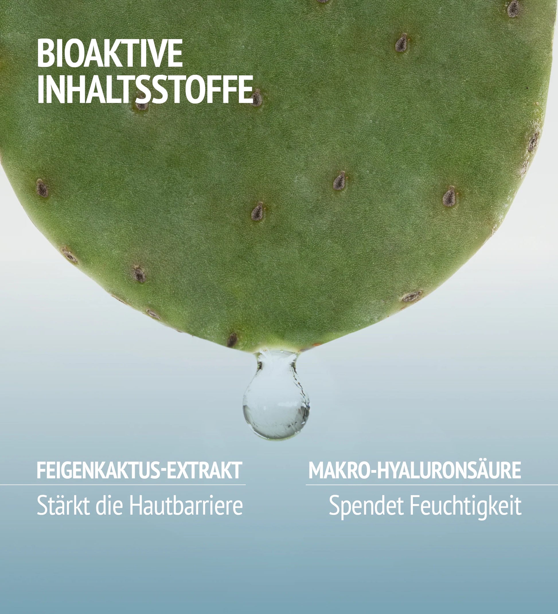 - ЭКСТРАКТ КАКТУСА ОПУНЦИИ, полученный путём регенеративного органического земледелия, в сочетании с гиалуроновой кислотой гарантирует оптимальное впитывание и мгновенное увлажнение с эффективностью +70%.